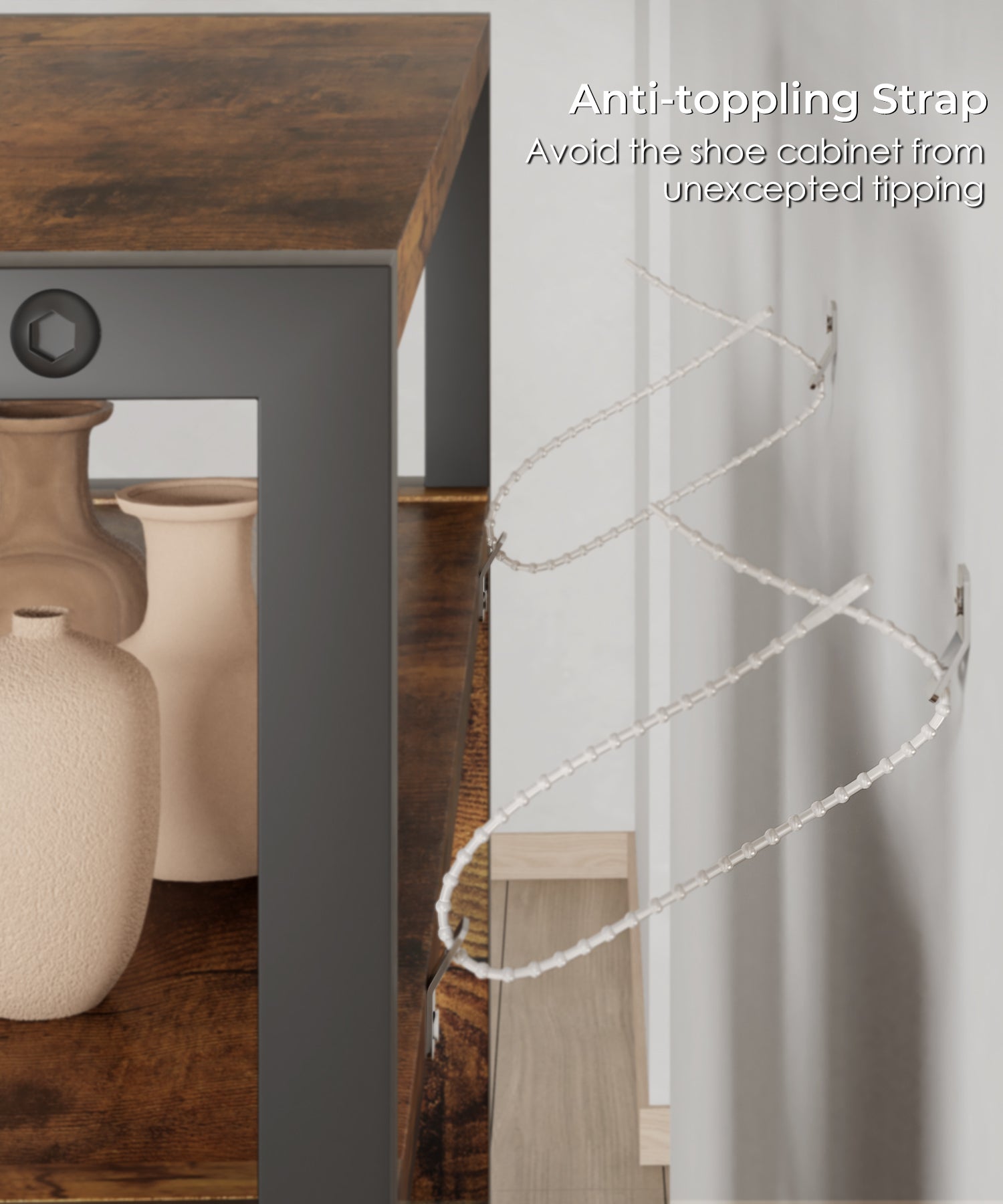 - ⚠Safety Always Matters - With four sturdy metal adjustable feet on the base, this industrial wood shoe storage cabinet will function as a piece of stable & reliable furniture standing on whether carpet or hardwood floor. More importantly, a set of premium quality toppling preventing device included keeps the rack staying where it suppose to be and ensure family members' security in case there are energetic/ naughty teenagers among your family(lol)